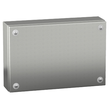 Industrial box for Spacial SBX. Multi purpose. 200 x 300 x 80 mm. Flat face box. Wall mounted on enclosure. Single piece body folded and welded. Cover by captive screws Cover by 4 captive screw PZ2 outside sealed area. Made of stainless steel 304L. Protection IP 66, IK10.